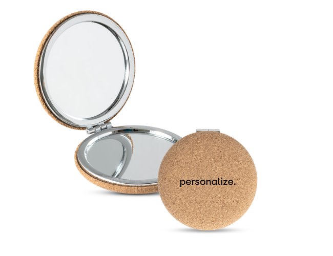 Espelho duplo com acabamento em cortiça e fechamento magnético. Ideal para kits onboarding sustentáveis.